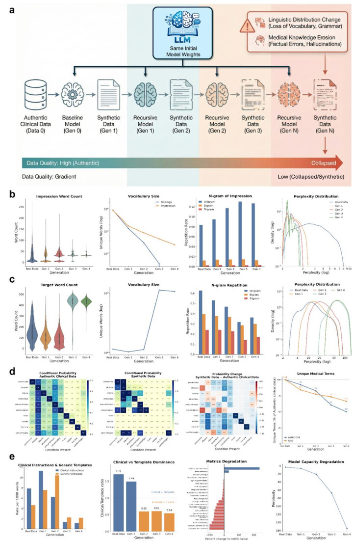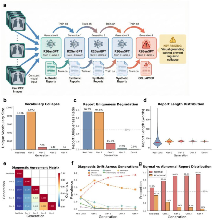 东谈主工智能在医学影像生成申诉的时刻,说话退化仍然会发生。参谋使用了 Swin-Transformer、Llama-2 的视觉说话模子 R2GenGPT,用确实的胸部 X 线片作念输入,只用合成申诉来西席。图 3 扫尾说明即使有确实的图像,模子也会出现严重的退化,申诉的独一性从蓝本的 96.2% 下落到现时的 0.9%,词汇量从蓝本的 8186 个减少到现时的 94 个,减少了 98.9%。