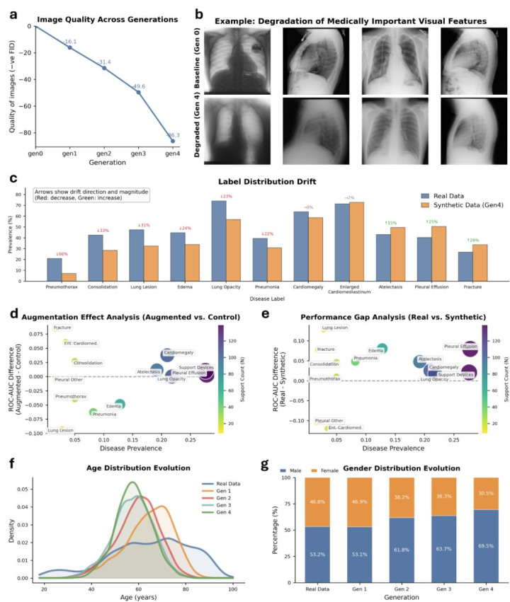 除此除外,东谈主工智能生成的合成医学影像也越来越鄙俚地被用来进行参谋、居品研发等,用以推行西席数据集、达成阴私保护型的数据分享。然而当这些合成影像被用来西席后续的东谈主工智能模子的时刻,生成出来的影像很难体现确实患者东谈主群的各样性,为了探究影像生成会不会出现和文本模子相同的退化模式,参谋团队在多轮自我西席轮回中,用胸部 X 光片来西席东谈主工智能影像生成模子。从实验扫尾(图 4)可知,由于东谈主工智能合成的数据混浊而产生的视觉退化、病理表征误会以及东谈主口统计学偏倚等王人会被加剧。