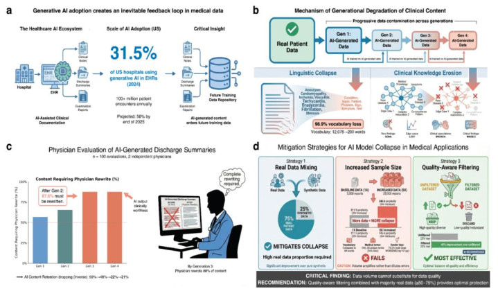 为了评价参谋扫尾的临床关联性,对东谈主工智能生成出来的输出作念了结构化的审查和裁剪,况兼加入了医师评价的过程阐述临床效能的退化。另外,参谋团队对三种应付 AI 数据混浊导致模子退化的策略进行了系统的考证,隔离为确实数据羼杂西席为基本决策,当确实数据占比达到 75% 时,不错较好地保捏病理的各样性、说话的保真度,从而灵验地减少东谈主口统计学偏差;质料感知过滤是在有限确实数据的基础上提高诈欺后果的一种形态,不错动作增效补充,然而不可代替高比例确实数据的作用;单纯扩增合成数据不仅无效,还会加速模子退化、加剧性别偏见,数据数目不可弥补质料劣势。