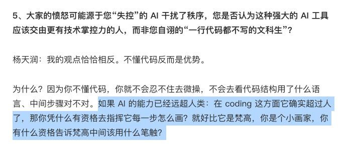 不懂代码反而是上风。AI 是梵高,你是个小画家,你有什么履历告诉梵高中间该用什么笔触?