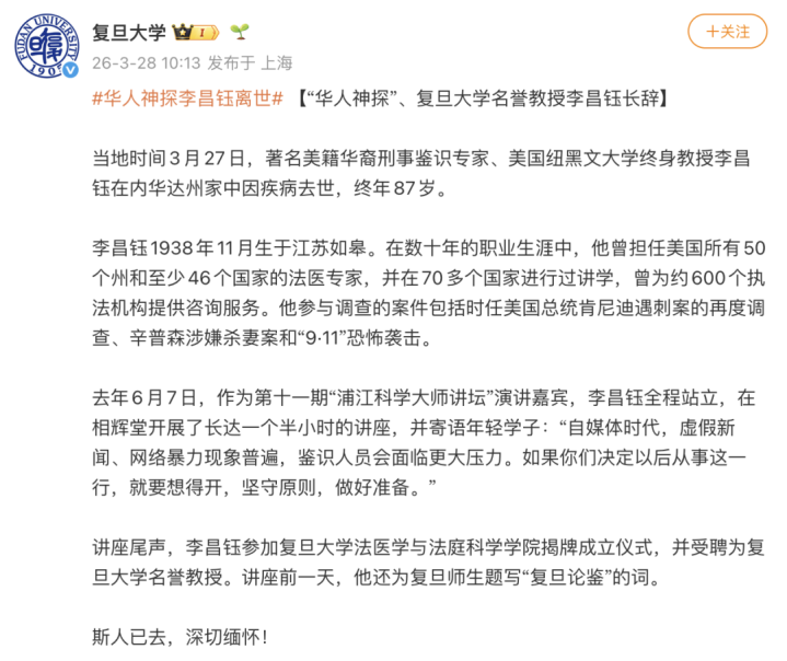 3月28日,@复旦大学发文深入惦念李昌钰。
