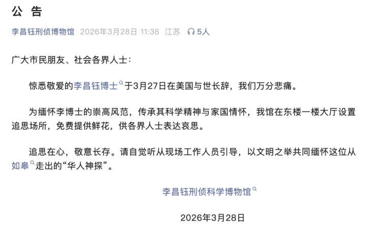 当地期间3月27日,有名好意思籍华侨刑事辨别内行、好意思国纽黑文大学终生培育李昌钰在内华达州家中因疾病升天,享年87岁。