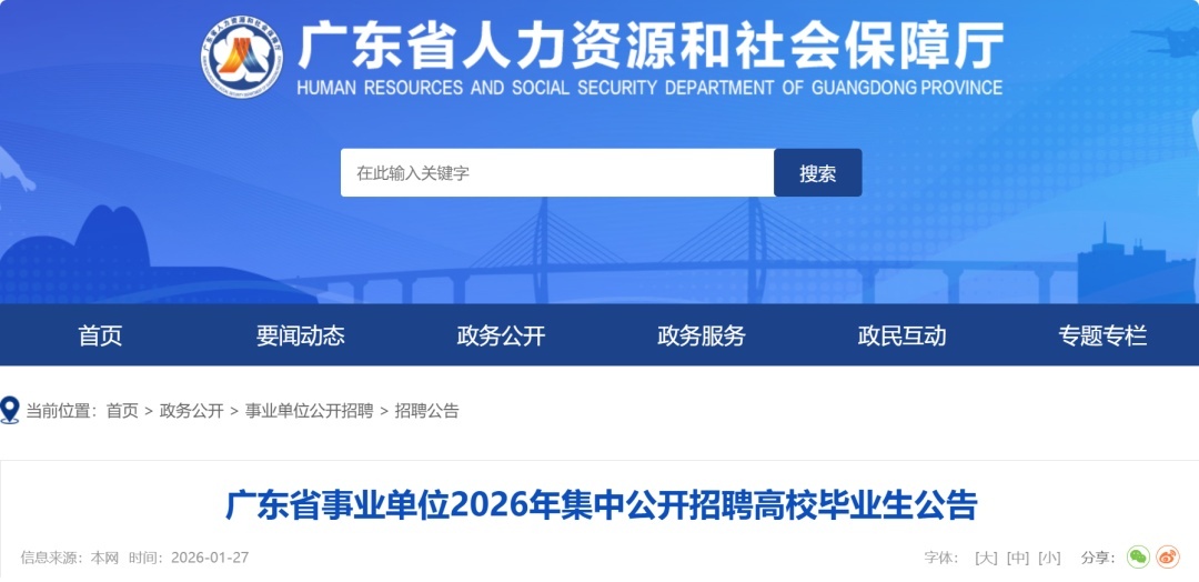 为贯彻落实省委、省政府“百万英才汇南粤”看成策动,诱骗优秀高校毕业生及强盛有志后生弃取广东、建造广东,把柄《中共中央组织部 东谈主力资源社会保险部对于进一步作念善劳动单元公开招聘责任的陈述》(东谈主社部发〔2024〕57号)和《广东省劳动单元公开招聘东谈主员观点》(粤府令第301号)等估量章程,省委组织部、省东谈主力资源社会保险厅决定贴近开展2026年全省劳动单元公开招聘高校毕业生责任。现就估量事项公告如下: