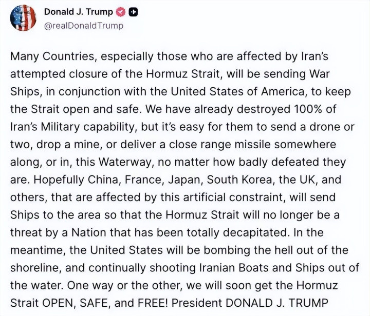 3月14日,特朗平庸过社交媒体发布推文,为抓续15天的好意思伊破裂建议新料理决策。他宣称已“完全瓦解”伊朗正规武装力量,却又不得不承认,残存的无东谈主机、水雷和短程导弹仍在扼守霍尔木兹海峡。